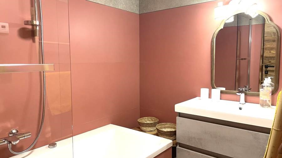 A l'étage, une pièce de vie avec table pour 12 personnes, une cheminée, un salon, une cuisine ouverte équipée ; la chambre "Chamois" avec 1 lit de 180 x 200 cm, séparable en 2 lits de 90 x 200 cm ; une salle de bains avec baignoire ; des toilettes séparées ; une porte-fenêtre donnant sur l'extérieur ;